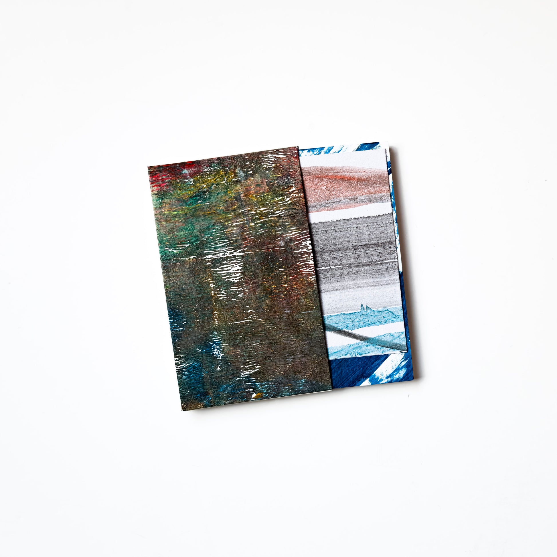 Concertina art book with sleeve cover. Acrylic ink and paint, and sea salt on paper.